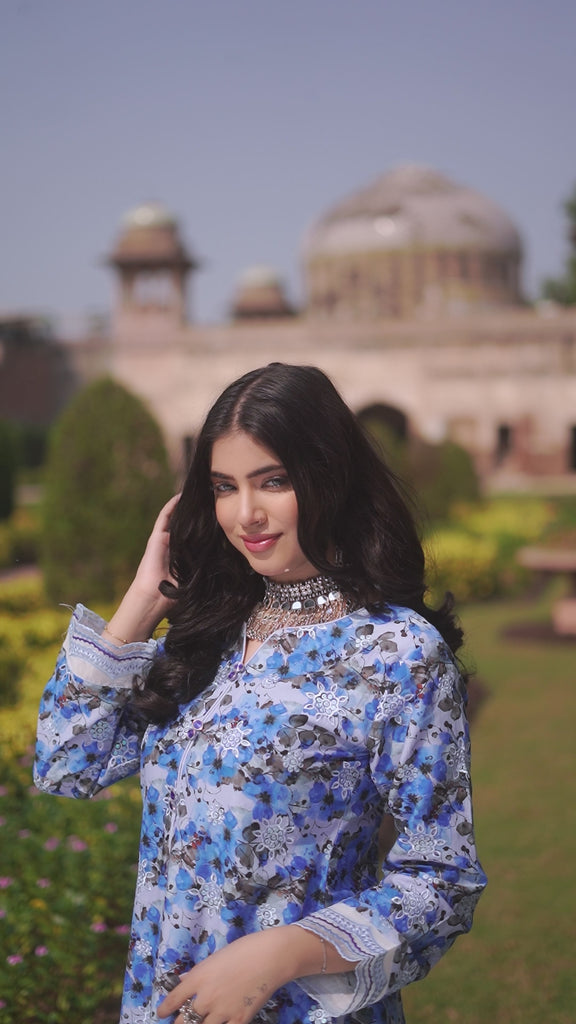 The long shirt showcases delicate white floral prints and intricate front embroidery, beautifully complemented by lace details on the cuffs and hem for a refined, feminine touch. Paired with matching printed cotton trousers and a flowy chiffon dupatta edged with lace, this outfit combines comfort with timeless sophistication.