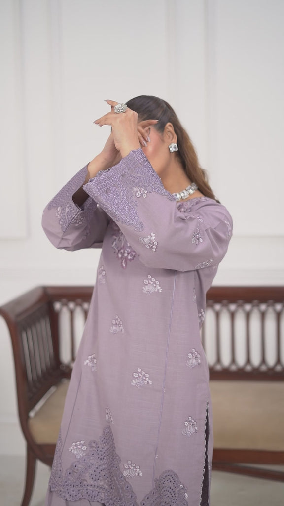 Lavender Embroidered Khaddar Suit with Farshi Shalwar & Wool Shawl