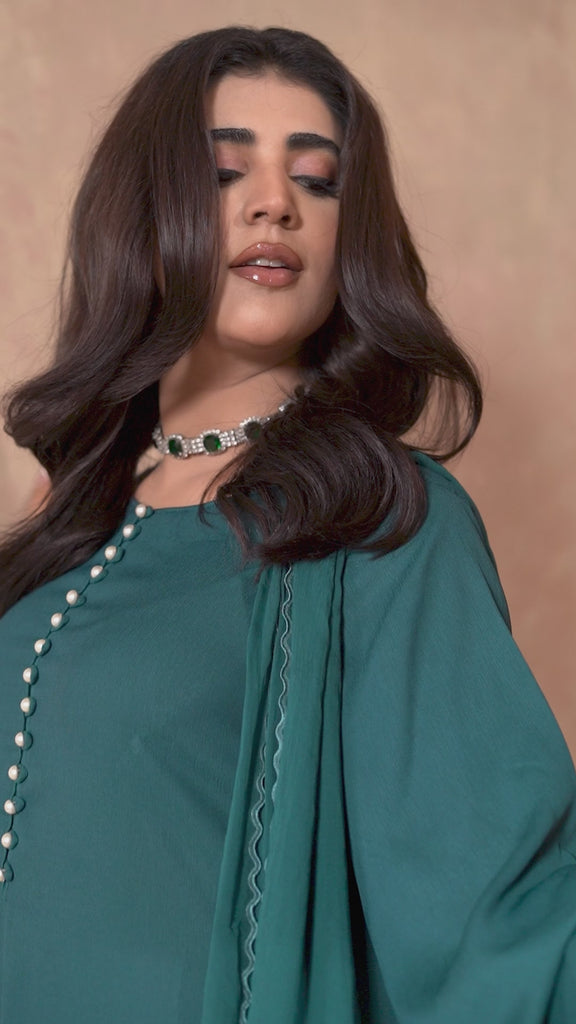This stunning teal long dress features a graceful, straight silhouette that drapes beautifully from shoulder to hem. The front is adorned with a row of decorative pearl-style buttons, adding a refined touch to the minimalist bodice. The full-length sleeves are designed with soft draping and embellished button details, giving them an elegant, contemporary flair. On one side, a sheer, flowy panel adds movement and dimension, finished with a subtle scalloped trim for a delicate finish.