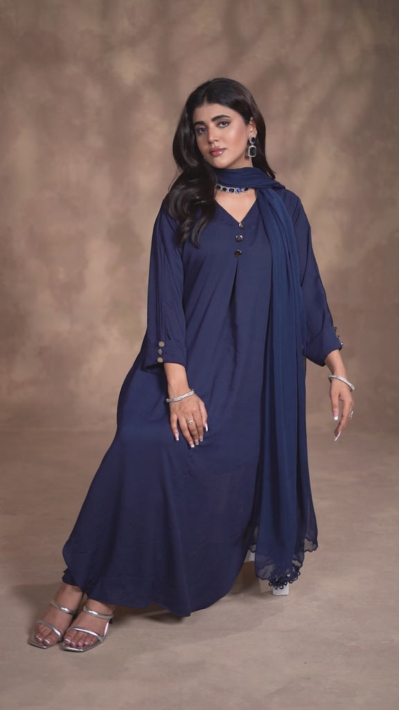 This stunning teal long dress features a graceful, straight silhouette that drapes beautifully from shoulder to hem. The front is adorned with a row of decorative pearl-style buttons, adding a refined touch to the minimalist bodice. The full-length sleeves are designed with soft draping and embellished button details, giving them an elegant, contemporary flair. On one side, a sheer, flowy panel adds movement and dimension, finished with a subtle scalloped trim for a delicate finish.