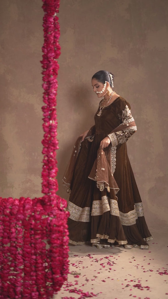 Let everyone adore the royal feel of this luxurious, soft, rich chocolate-brown velvet anarkali gown. This readymade, elegant gown has all the features you would expect, including exquisite floral motifs in intricate silver zari embroidery throughout the entire bodice, extending to the boat neckline and flared hemline. The stunning floral arrangements shimmer against the rich maroon velvet fabric. Elegant lines of the design, combined with a flowing skirt of layered ruffles and intricate embroidered borders, drape the body gracefully. The outfit is perfect for confident women who want to look amazing and feel fabulous!