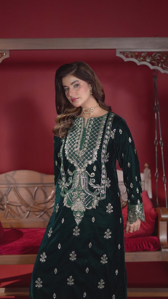 Make a bold and elegant statement with this emerald green velvet 3-piece suit, crafted for women who love timeless sophistication. Featuring intricate gold embroidery and a rich velvet finish, this outfit is perfect for weddings, Eid, festive gatherings, and formal evening events.