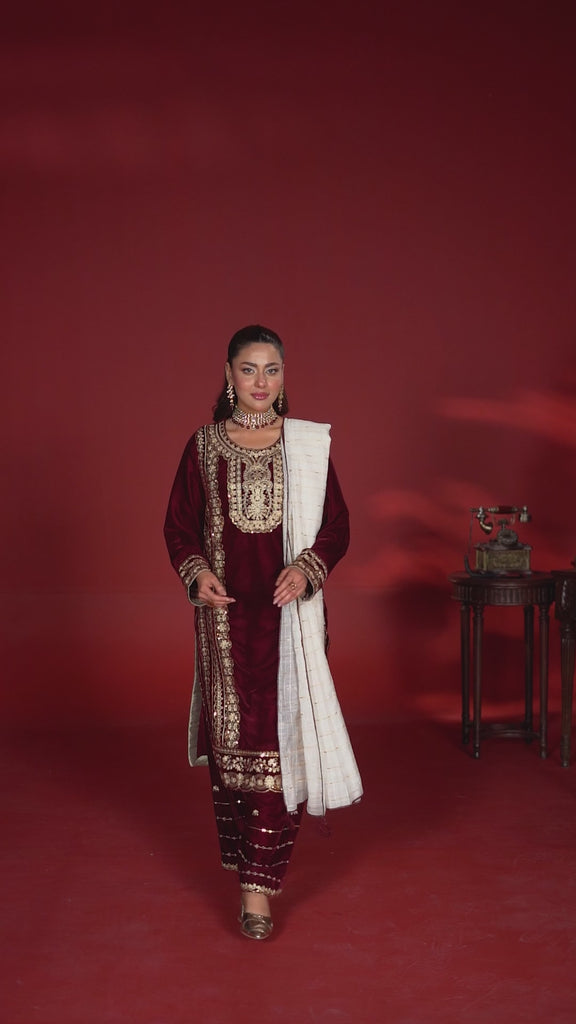 Elegant MAHROON Embroidered 3-Piece Velvet Shalwar Suit