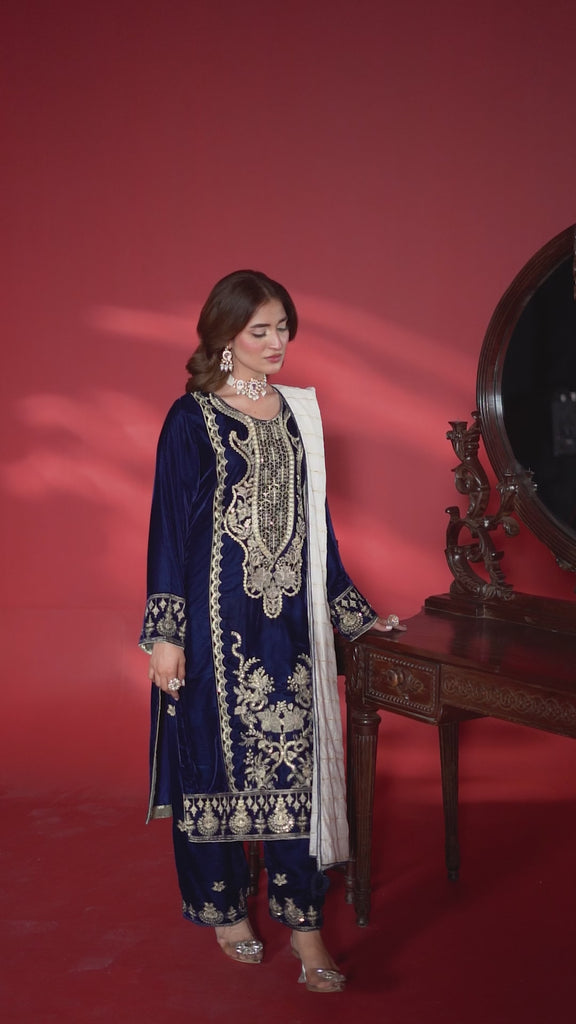 Elegant Royal Blue Embroidered 3-Piece Velvet Shalwar Suit
