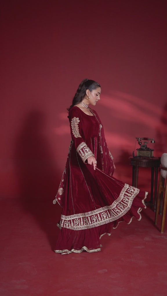 Step into regal elegance with our Royal Maroon Velvet Kalidar. Meticulously crafted for the modern woman who cherishes tradition, this ensemble is the perfect choice for winter weddings, formal dinners, and festive galas.